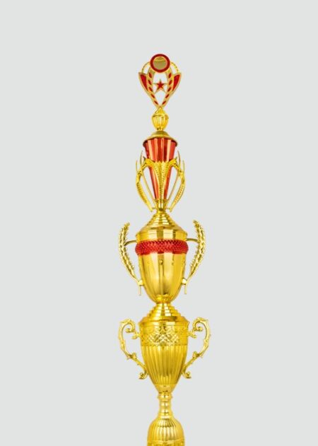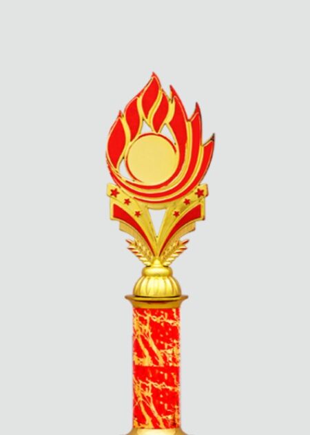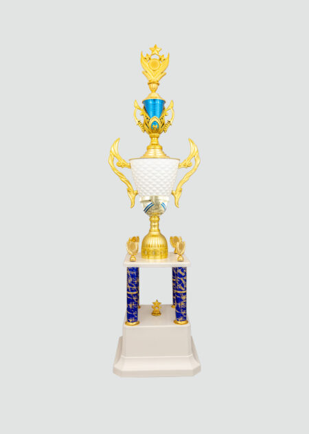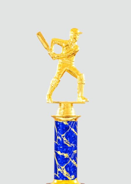 This is a description of a trophy. It is a tall, elegant trophy with a gold design. The top of the trophy features a golden cricket player figurine. The base of the trophy is red and blue with a marbled design. This trophy would be a great award for a cricket tournament or special occasion.