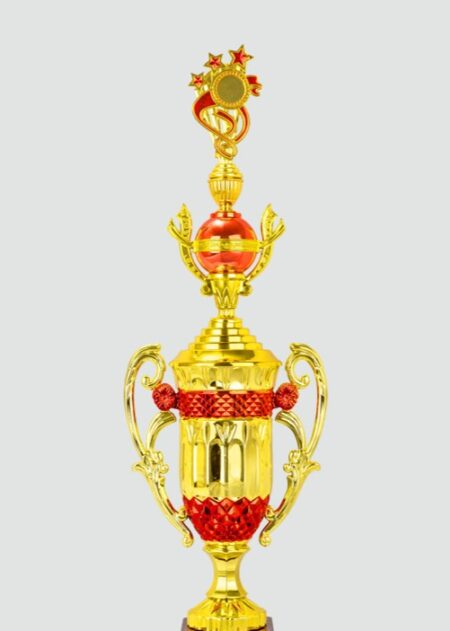 • Golden trophy with intricate detailing, red globe centerpiece, and star-accented topper. Perfect for sports, academic achievements, and recognition events.