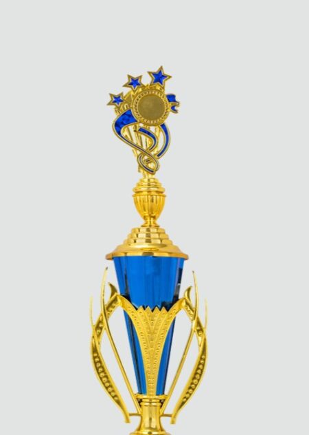 • Elegant blue trophy with gold accents, laurel wreath design, and sturdy base. Perfect for honoring achievements and celebrating success in any event or competition.