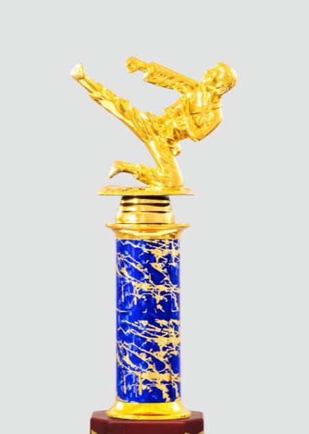 • Martial arts trophy, karate trophy, taekwondo trophy, sports award image. Side kick, gold, blue, and red design. Ideal for martial arts-related content.