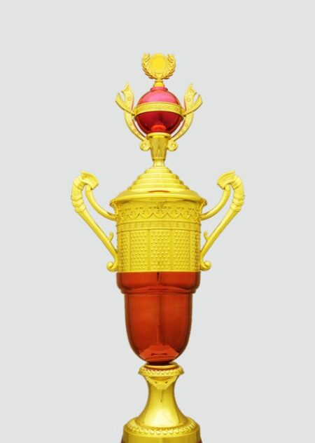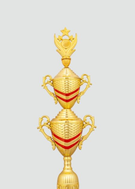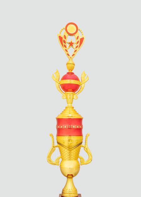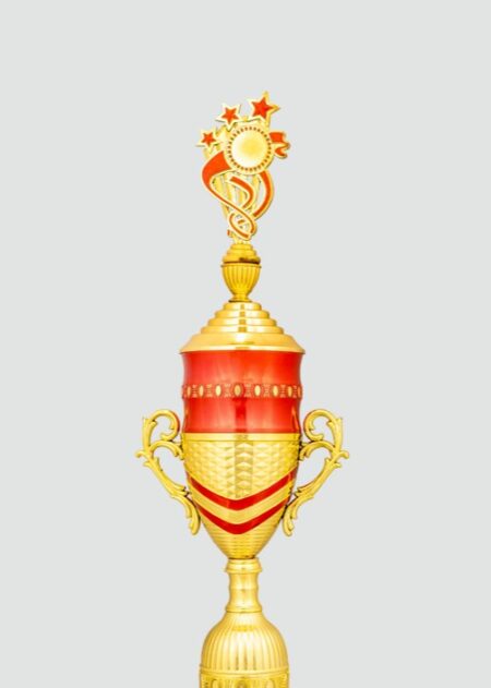 Elegant red and gold trophy with star figurines, symbolizing excellence and achievement. Perfect for celebrating outstanding performances and honoring success.