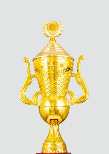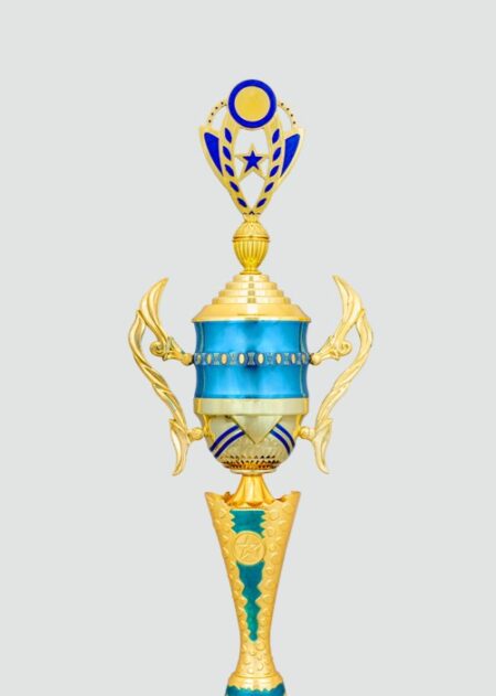 Elegant gold and blue trophy with a star-themed top, intricate design, and a bold red base. Perfect for celebrating achievements and outstanding performances.