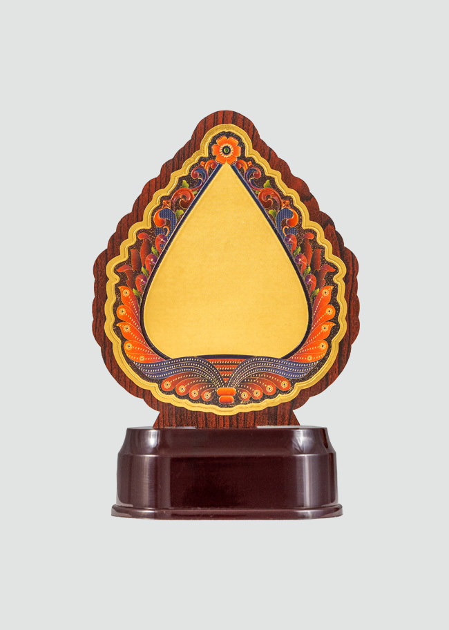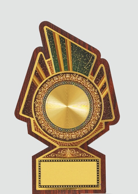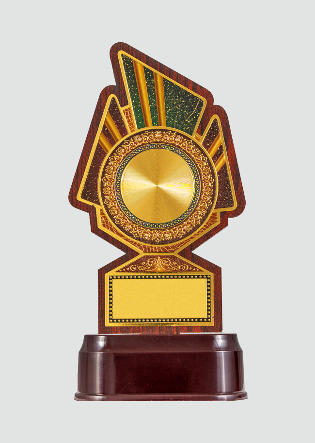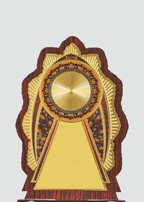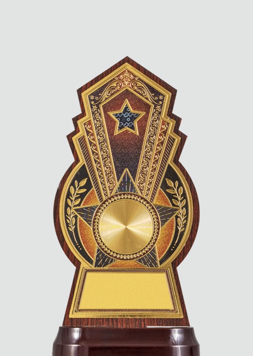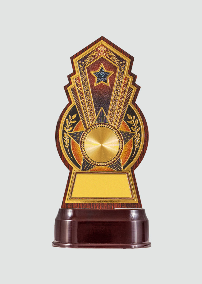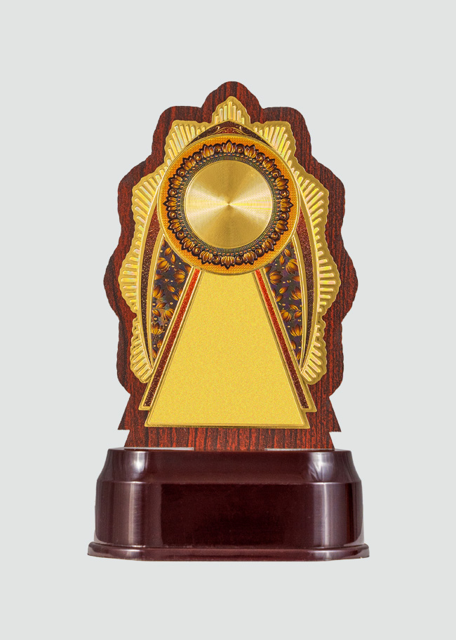 “This unique trophy features a sunburst design with a gold plate and intricate detailing, making it a symbol of brilliance and achievement.