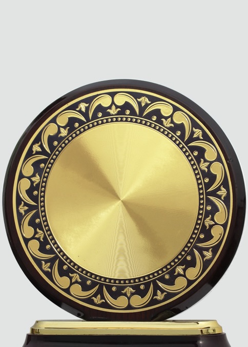 This handcrafted wooden trophy features a circular design, a golden center plate for engraving, and intricate floral motifs. A stunning award for any occasion.
