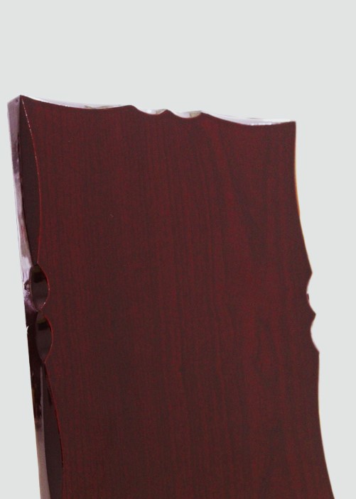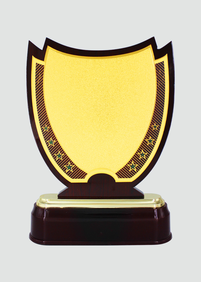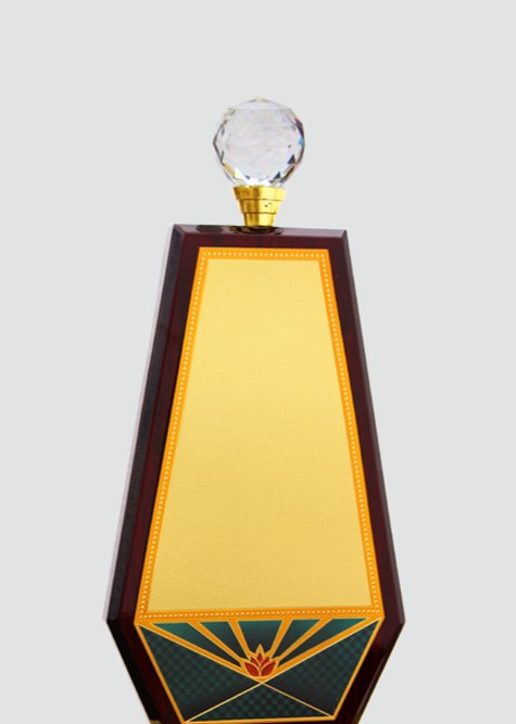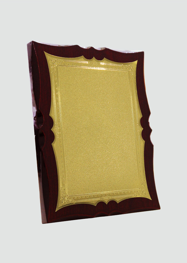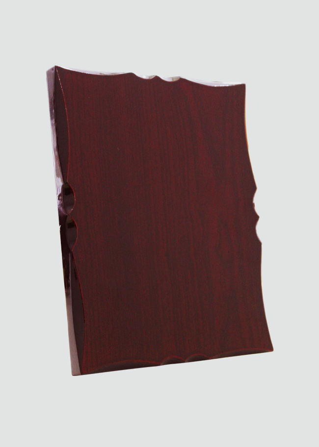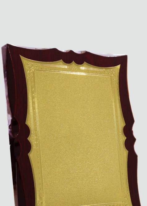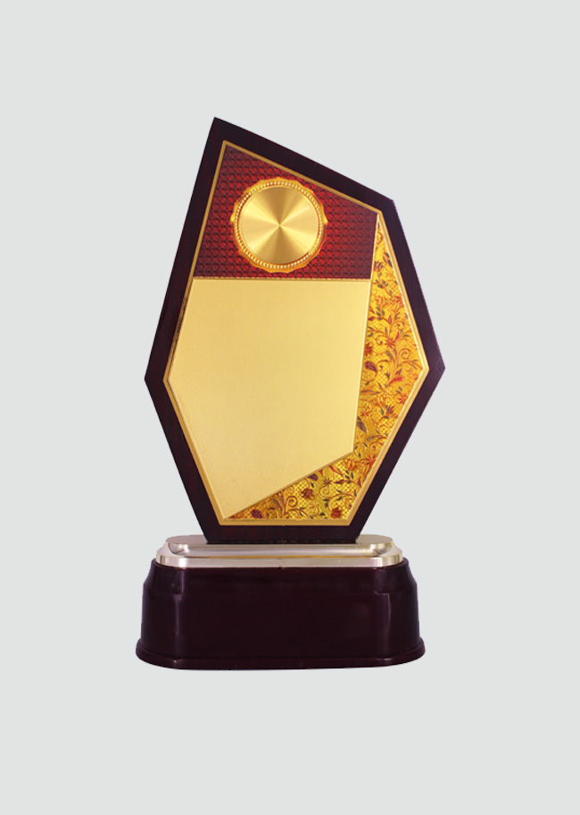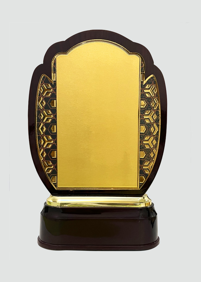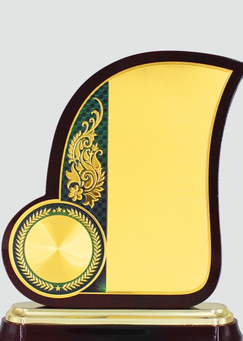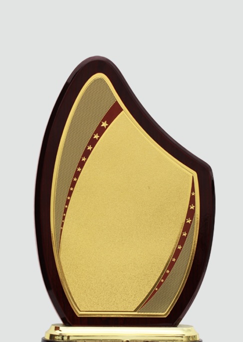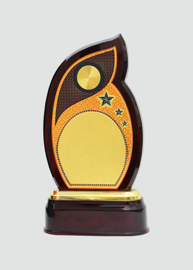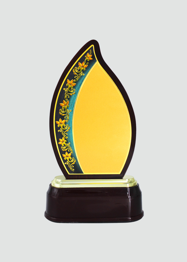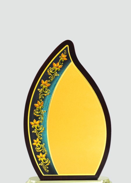 This elegant wooden trophy features a unique flame-like design with a golden center plate for personalization. The base showcases intricate floral motifs, adding a touch of elegance.