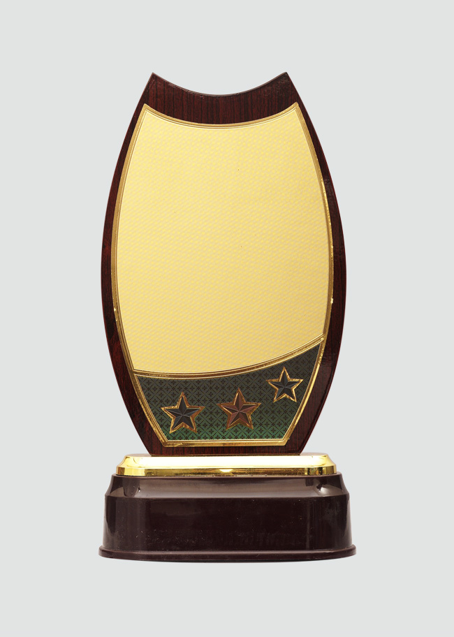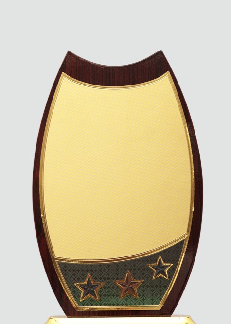 “This handcrafted wooden trophy features a unique teardrop-shaped design, a golden center plate for engraving, and intricate star and geometric motifs. A stunning award for any occasion.