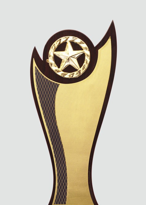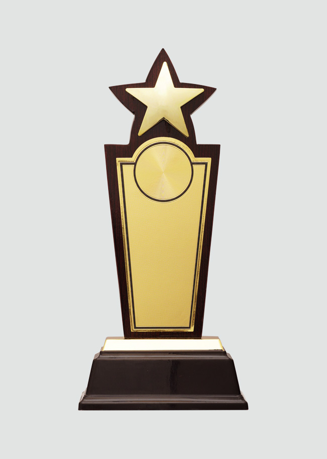 This handcrafted wooden trophy features a unique flame-like design, a golden center plate for engraving, and a star motif. A stunning award for any occasion.