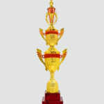 This impressive two-tier trophy features a dazzling golden design highlighted with vibrant red accents. The intricately crafted handles and ornamental details add a touch of sophistication, while the star-themed figurine at the top symbolizes excellence and achievement. Its sturdy multi-tiered wooden base provides durability and elegance, making it an ideal choice for honoring outstanding performances in sports, academics, or corporate events. This trophy is a perfect blend of style, prestige, and craftsmanship, creating a memorable symbol of success.