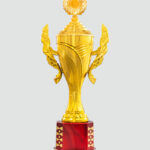 The image features a regal trophy with a polished gold finish and a distinctive design. The central cup is adorned with sleek, symmetrical patterns, giving it a modern yet sophisticated appearance. Two laurel-inspired handles extend gracefully on either side, symbolizing victory and honor. The trophy is mounted on a sturdy, glossy red base that enhances its visual appeal. Ideal for recognizing outstanding achievements in sports, academics, or special events.