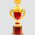 This trophy is a perfect way to celebrate success. It features a bright gold finish, a round top with a laurel wreath, and elegant handles on the sides. The vibrant red body adds a bold touch, while the sturdy red base with gold star accents completes the stylish design. Ideal for honoring achievements at any event or competition!