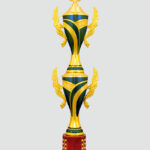 This is a double-layered trophy with a blue and gold design. It has two cup-shaped sections decorated with golden leaf patterns and is topped with a round emblem surrounded by a laurel wreath. The trophy stands on a base with gold details, making it perfect for awards and special events.